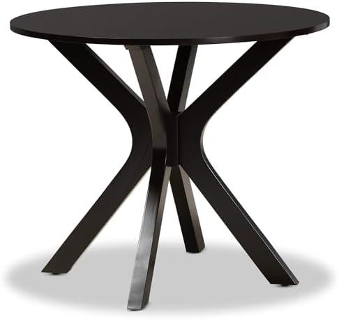 This elegantly designed dining table showcases sleek curves and a rich espresso brown finish that enhances any dining space. Built from sturdy rubberwood and MDF, it comfortably accommodates up to four people, making it a perfect choice for both casual family meals and more formal dining occasions. The round tabletop allows for ample elbow room, while the unique splayed legs create a sculptural base that adds an artistic touch from every angle. With dimensions of 34.3″ x 34.3″ x 30″ and a weight of 29.8 lbs, it is both compact and sturdy.