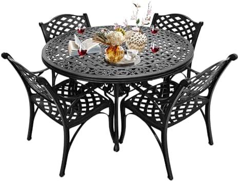 This stylish patio dining ensemble is designed for outdoor comfort and functionality, featuring a beautiful round table accompanied by four chairs. The high-quality cast aluminum material promises durability and resistance against rust, making it an excellent choice for any weather conditions. The table comes equipped with a 2.3-inch umbrella hole, allowing you to easily insert an umbrella for sun protection. Perfect for gatherings of 4 to 6 people, its elegant black finish enhances the aesthetics of patios, backyards, or decks while providing ample space for meals and drinks.