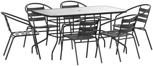 Create a stylish outdoor dining experience with this elegant furniture set, which includes a spacious rectangular table complemented by six modern patio chairs. The table features a stunning rippled glass tabletop, providing a smooth surface that maintains balance for your dishes and drinks, making it perfect for outdoor dining. Its black metal base adds an attractive contrast, and the weather-resistant solid steel frame ensures durability, supporting up to 121 pounds. The lightweight aluminum slat back chairs, designed with gently sloped arms, not only offer comfort but also stack neatly for easy storage – allowing you to maximize your space when needed.