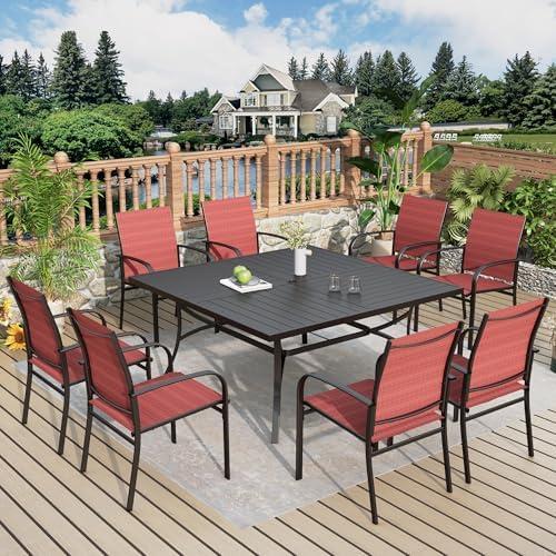This outdoor furniture ensemble is designed to enhance your backyard or garden, effortlessly combining functionality and style. The set features a large square table paired with eight vibrant red Textilene chairs, providing ample seating for family and friends. The breathable fabric offers comfort and good airflow while withstanding high temperatures. Additionally, the table is equipped with a 1.57-inch umbrella hole, allowing for sunshade options to enjoy outdoor dining on warm days. The premium metal frame is rust-resistant and ensures durability for long-lasting use, while the chairs can hold up to 350 lbs, making them suitable for everyone.