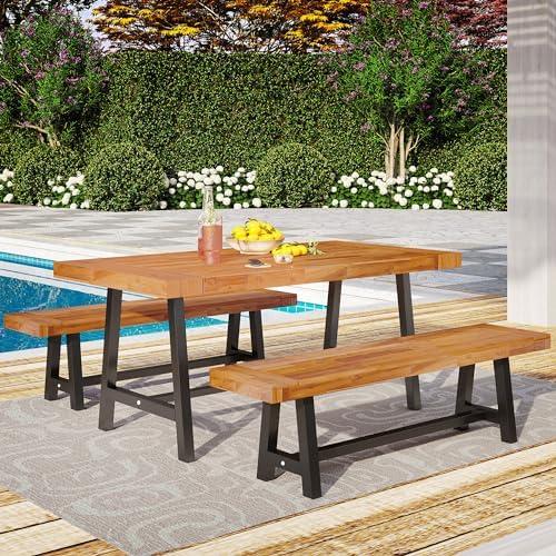 This outdoor dining set combines a wooden table and two benches crafted from 100% acacia wood. The oil-finished surface enhances its weather resistance, ensuring longevity and reducing maintenance needs. The sturdy design features heavy-duty trapezium wood legs with non-slip foot pads, providing stability while accommodating up to five or more people. With a generous table size of 67.7″ x 35.4″ x 29.7″, and benches measuring 63.0″ x 14.4″ x 17.9″, this set is perfect for family gatherings or enjoying meals on the porch or balcony.