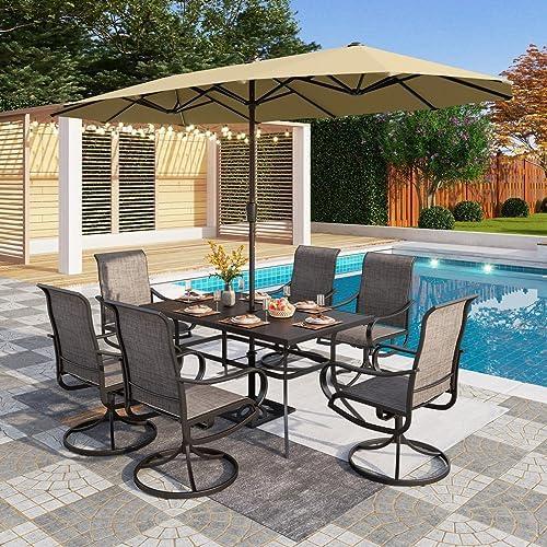 The outdoor dining arrangement offers a fantastic blend of aesthetics and functionality, making it perfect for various settings including backyards and patios. The set comprises six outdoor swivel chairs made from durable Textilene fabric, providing enhanced comfort with their high backs and curved armrests. The accompanying metal dining table features a spacious surface for meals and activities, complemented by a 1.9″ umbrella hole designed to accommodate the large 13ft umbrella that provides ample shade during sunny days. Constructed with rust-resistant, powder-coated materials, the overall design ensures longevity and ease of maintenance, making it suitable for all-weather use.