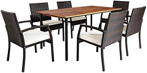 While this set boasts many advantages, there are a few considerations to keep in mind. Pros include its all-weather structure, made with durable PE wicker and a powder-coated steel frame, ensuring longevity and rust resistance. Additionally, the slatted table design prevents water accumulation, contributing to its durability. However, the cons might include the potential need for regular maintenance of the acacia wood tabletop to keep it looking fresh and the fact that assembly can be somewhat complex, requiring time and effort. this dining set offers an enjoyable outdoor dining experience, blending comfort with aesthetic appeal.
