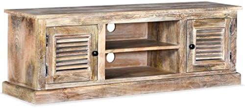 This beautifully crafted entertainment stand offers a rustic charm that can enhance the style of any living space. Made from solid mango wood, it boasts remarkable durability and stability, ensuring it withstands the test of time. The unique treatment applied to the wood not only increases its wear resistance but also preserves its natural beauty. With two spacious cabinets and two open shelves, this piece is perfect for organizing your media devices, such as gaming consoles and streaming devices, while adding a vintage feel to your décor. Each unit is unique due to the natural variations in wood grain and color, offering a personalized touch to your home.