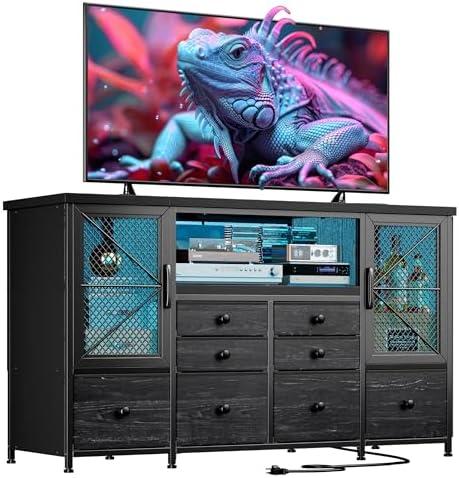 TV Stand with Dresser for 55-60 inch TVs, 8 Drawers, LED Lights & Power Outlets