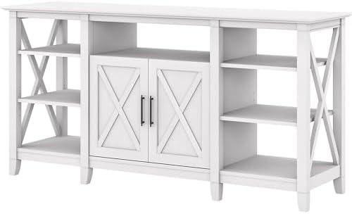 This stylish entertainment center brings a touch of coastal charm to your home with its unique X pattern accents and versatile finishes. Accommodating up to a 65-inch television and 75 pounds, this stand features a center cubby with cable management for easy setup of your DVD player or game console. The adjustable shelf within the two-door cabinet ensures your media collection stays organized, while open storage areas with fixed shelves provide additional space for displaying decorations or housing extra items.