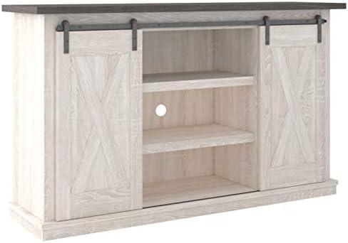 This TV stand seamlessly merges modern farmhouse aesthetics with practical functionality. Its two-tone finish, combining a replicated gray wood top with an antique white base, creates a visually appealing contrast. Featuring sliding barn doors that can be centered or offset, this piece not only enhances your decor but also provides easy access to your media equipment. With adjustable shelving and cutouts for efficient wire management, you’ll keep your entertainment area tidy while accommodating various electronics. Measuring 54” W x 15” D x 32” H, it’s perfectly sized for flat-screen TVs up to 50 inches.