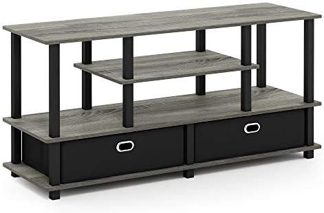 Designed with modern lifestyles in mind, this TV stand accommodates screens up to 55 inches and features a spacious top panel that provides an ideal display area. The combination of CARB Grade composite wood and sturdy PVC tubes ensures durability and stability, making it a reliable choice for your entertainment setup. Its sleek design, complemented by a stunning French Oak finish in grey and black, adds a touch of sophistication to any room. Open display shelves give easy access to your entertainment equipment, while the two enclosed compartments offer hidden storage for DVDs, games, and other loose items.