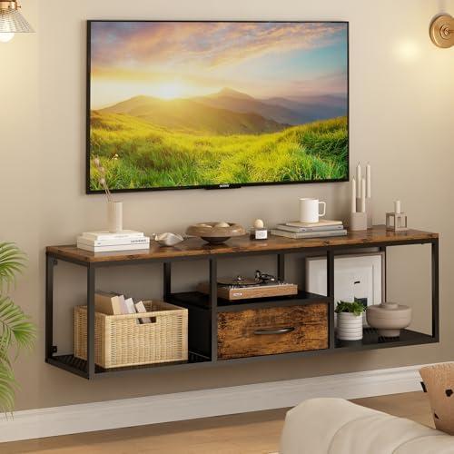 This wall-mounted entertainment center offers a spacious design with ample storage that allows you to organize media accessories, DVDs, and game consoles effectively. The open media console enhances ventilation for your electronic devices, helping to prevent overheating while keeping everything within easy reach. Its unique combination of a vintage wood grain top and a sleek matte black metal frame allows it to fit seamlessly into a variety of decor styles, from modern to industrial and farmhouse aesthetics.