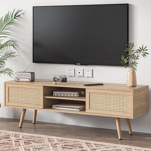 This chic TV console blends modern aesthetics with classic elegance, featuring natural rattan and wood grain finishes that enhance any living space. Designed for TVs up to 60 inches, it includes two storage cabinets with sliding doors and an open shelf to keep your items organized. The cable management holes at the back ensure that cables stay tidy, contributing to a more streamlined look in your home. With a sturdy construction supported by solid wood legs, this piece is not only visually appealing but also built to last.