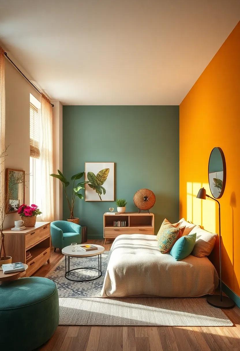 To maximize the impact of both vibrant and muted tones, consider using them strategically in various elements of the room: