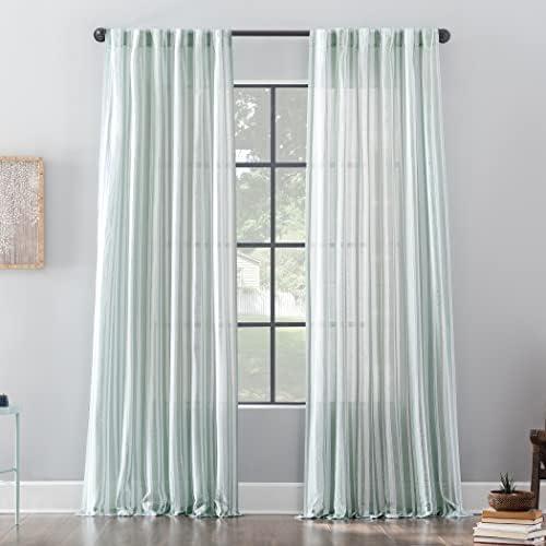 The semi-sheer fabric of this curtain allows natural light to filter through, creating a warm and welcoming atmosphere. Its 100% cotton composition ensures breathability and comfort, while the stonewashed seersucker striped design adds a touch of coastal charm to your decor. Designed with functionality in mind, it features a buttoned back tab for easy hanging on curtain rods up to 1 ½ inches in diameter. Available in a soothing spa green hue, measuring 50″ in width and 84″ in length, this panel seamlessly complements various interior styles.